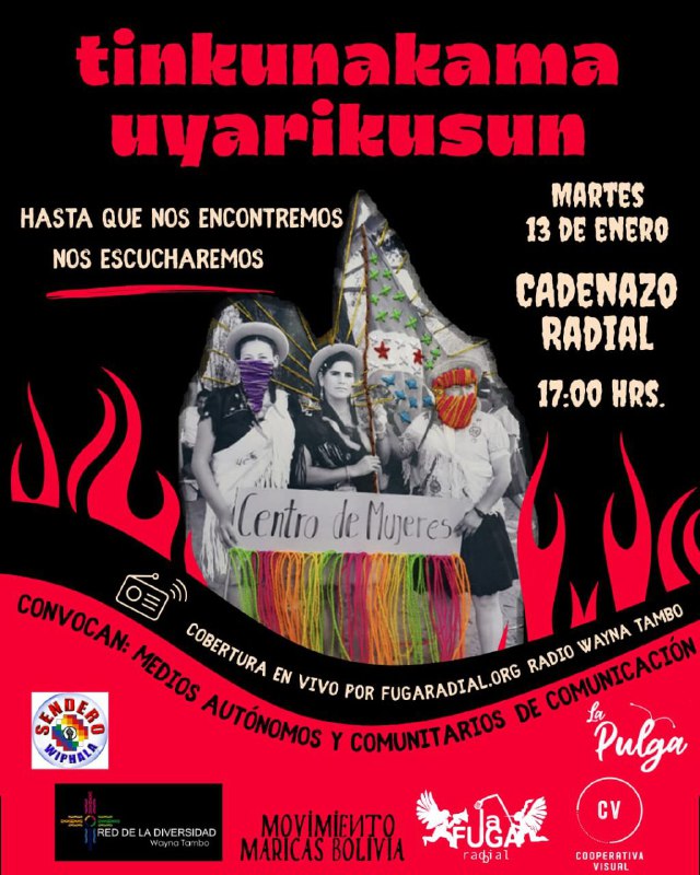 Tinkunakama uyarikusun - hasta que nos encontremos, nos escucharemos.Cadenazo radial de medios comunitarios y autónomos de comunicación Desde diversos medios de comunicación alternativos nos hemos organizado con distintos contenidos para poder divulgar y escuchar diversas voces desde Múltiples territorios a nivel nacional para visibilizar vivencias, reflexiones y demandas en torno a los sucesos originados desde la promulgación del DS 5503.Rechazamos contundentemente la intromisión e imposiciones imperialistas, gringas y otras, en nuestros territorios y en pro de nuestras autonomías y soberanía, abrimos un espacio de escucha para poder encontrarnos en estos tiempos de violencias, pero también tiempos que hacen posibles procesos de re-existencia y crianza de la vida a partir de la reorganización de la lucha y el volver a disputar y ocupar el espacio público y el espacio comunicacional desde la diversidad de nuestras voces.Este cadenazo cuenta con colaboraciones de:Red de la DiversidadCooperativa VisualMovimiento Maricas BoliviaLa Pulga Podcasty nosotras como Fuga RadialAquí un registro y memoria de la lucha creativa: