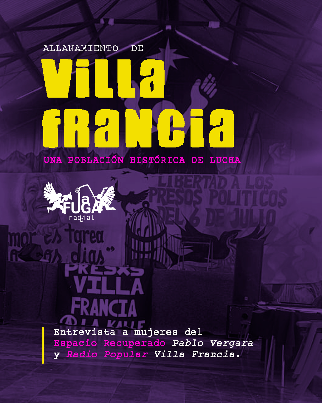 "Tiene el derecho la juventud pobre de las poblaciones de quemarlo todo, de hacerlo todo tiras, de romper todo, porque a ellos le han quitado todo desde que nacen. Tienen todo el derecho, háganlo compañeros! ¡Háganlo!”. (Luisa Toledo)Villa Francia, una de las poblaciones mas emblemáticas del Santiago profundo, fue sede de rebeliones y represiones en continuo.Fue habitad de nuestra ancestra combativa Luisa Toledo, quien perdió a 3 de sus hijos en manos de la dictadura pinochetista. Fue sede, también, de la primera radio comunitaria de Chile, el medio de comunicación popular Radio Villa Francia que lucha por seguir re existiendo hasta el día de hoy.El MIR, izquierda revolucionaria tuvo una importante presencia política en la pobla que todavía se siente y se respira en sus calles y murales como un recuerdo de un territorio profundamente político.Al ser un territorio ocupado y empobrecido, el apoyo mutuo, el amor por la comuna y la reflexión política fue siempre parte del hacer. Encarnado la resistencia en comedores populares, talleres colectivos y brigadas de propaganda. Por ende, los ataques, la vigilancia y persecución permanentes no ha cesado.Durante la madrugada del 6 de Julio del 2024, el mismo día que se conmemoraban los 3 años del fallecimiento de Luisa, la Radio Villa Francia y el Espacio Pablo Vergara Toledo fueron allanados y 14 compañerxs quedaron detenidxs, todo bajo el gobierno progresista de Boric.La madrugada del 20 de noviembre de este año, al dia siguiente de una jornada por la libertad de lxs presxs políticxs del 6 julio, realizada en el marco de un encuentro latinoamericano de artistas gráficos, el espacio Pablo Vergara Toledo fue nuevamente allanado. Se descerrajaron los ingresos, y registraron el espacio, utilizando detectores de metal, drones y excavaciones, en búsqueda de armas de fuego, sin ningun resultado. En este allanamiento se llevaron a dos personas detenidas, dejandoles en libertad horas después por falta de pruebas.No es coincidencia que el allanamiento se haya dado después del mencionado evento. Porque lo que se busca es criminalizar los encuentros políticos, instaurar el miedo para desarmar los fuertes vínculos que se deprenden de este espacio.Que vivan los espacios recuperados!Que vivan los medios libres!