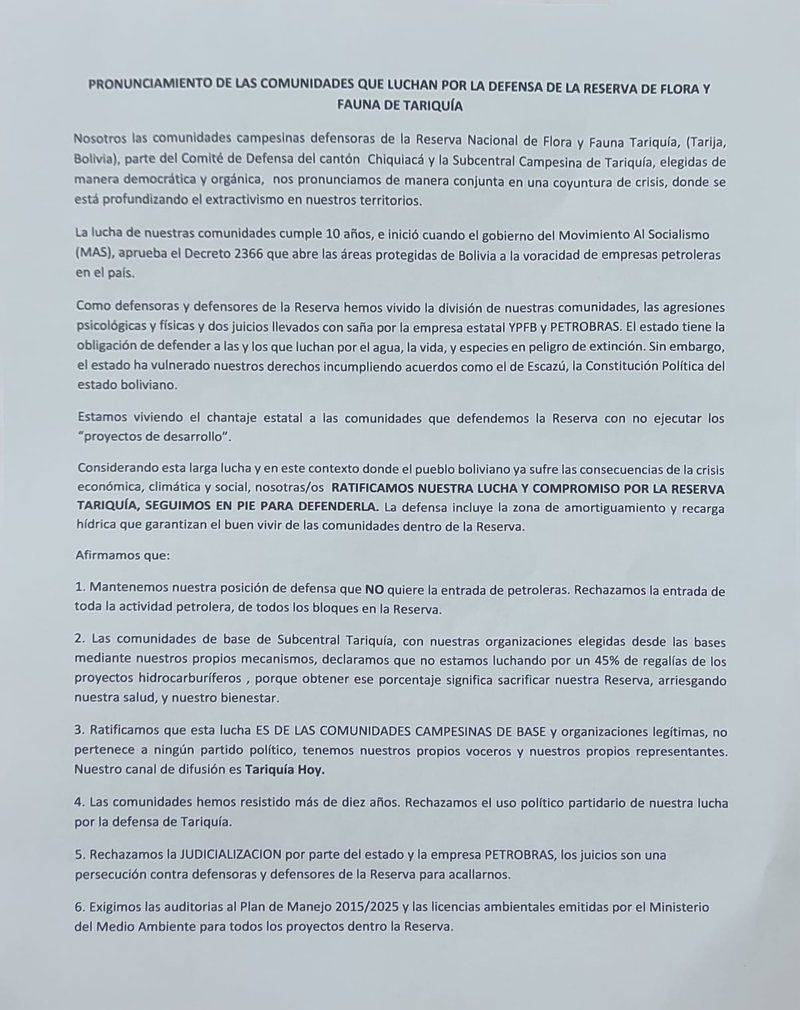 En el carrete: "Pronunciamiento de las comunidades por la Defensa de la Reserva de Flora y Fauna de Tariquía".